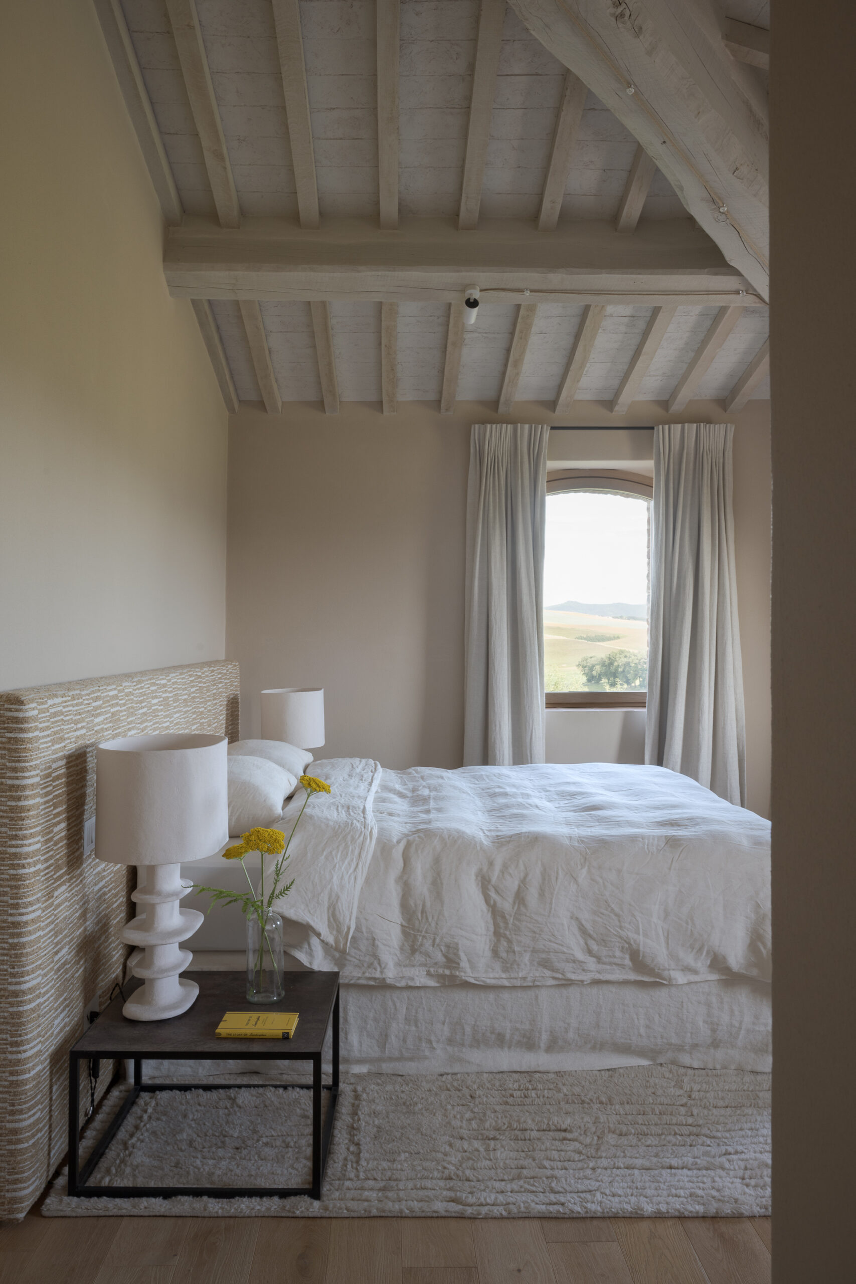 De tweede verdieping herbergt één bijzondere slaapkamer met een spectaculair 360°-uitzicht over de glooiende heuvels van Umbrië en Toscane. Een unieke plek om te ontwaken.